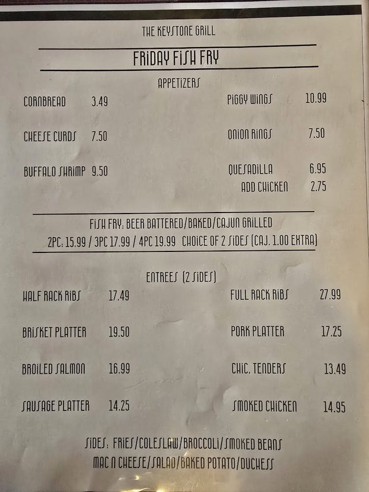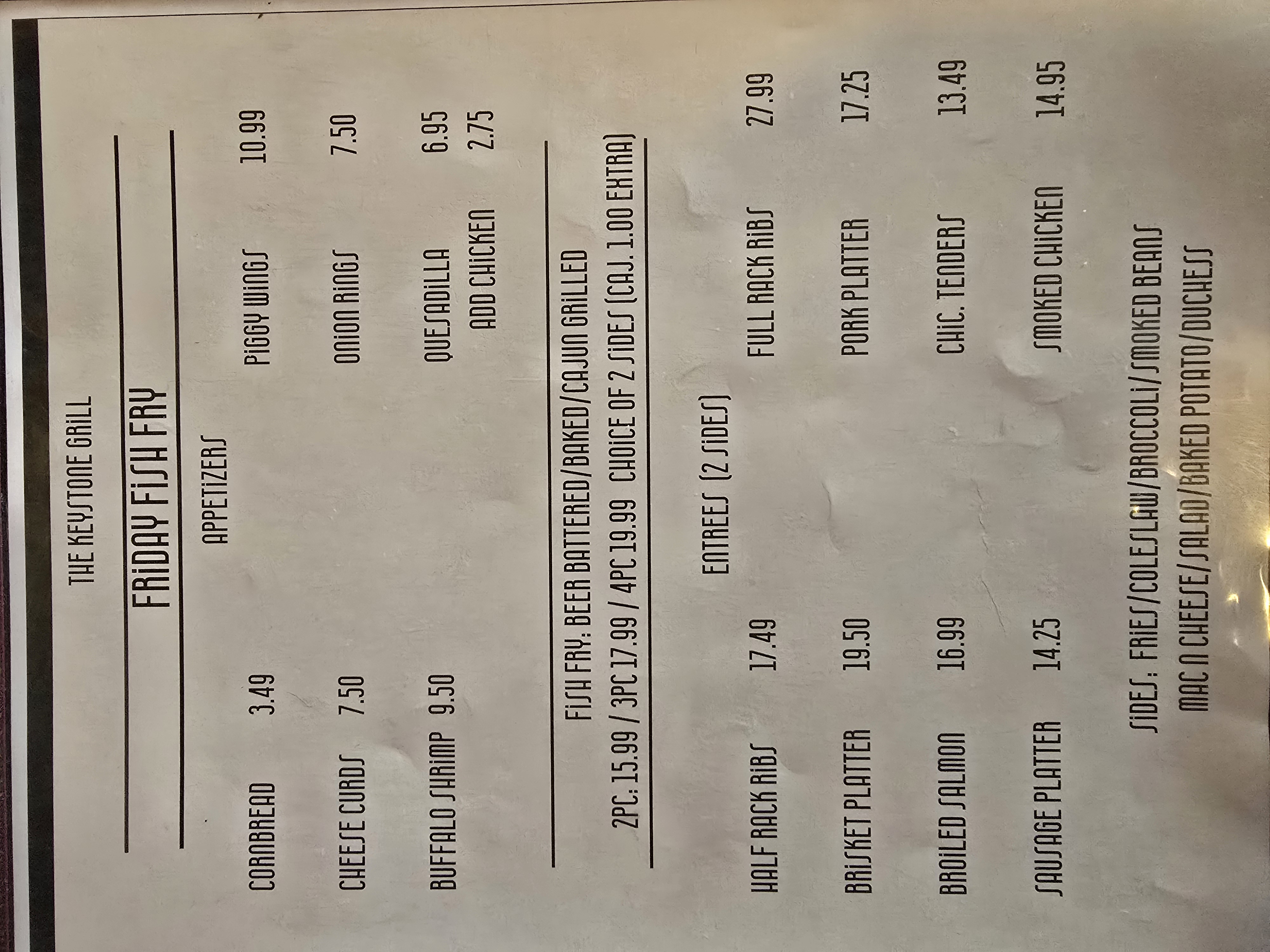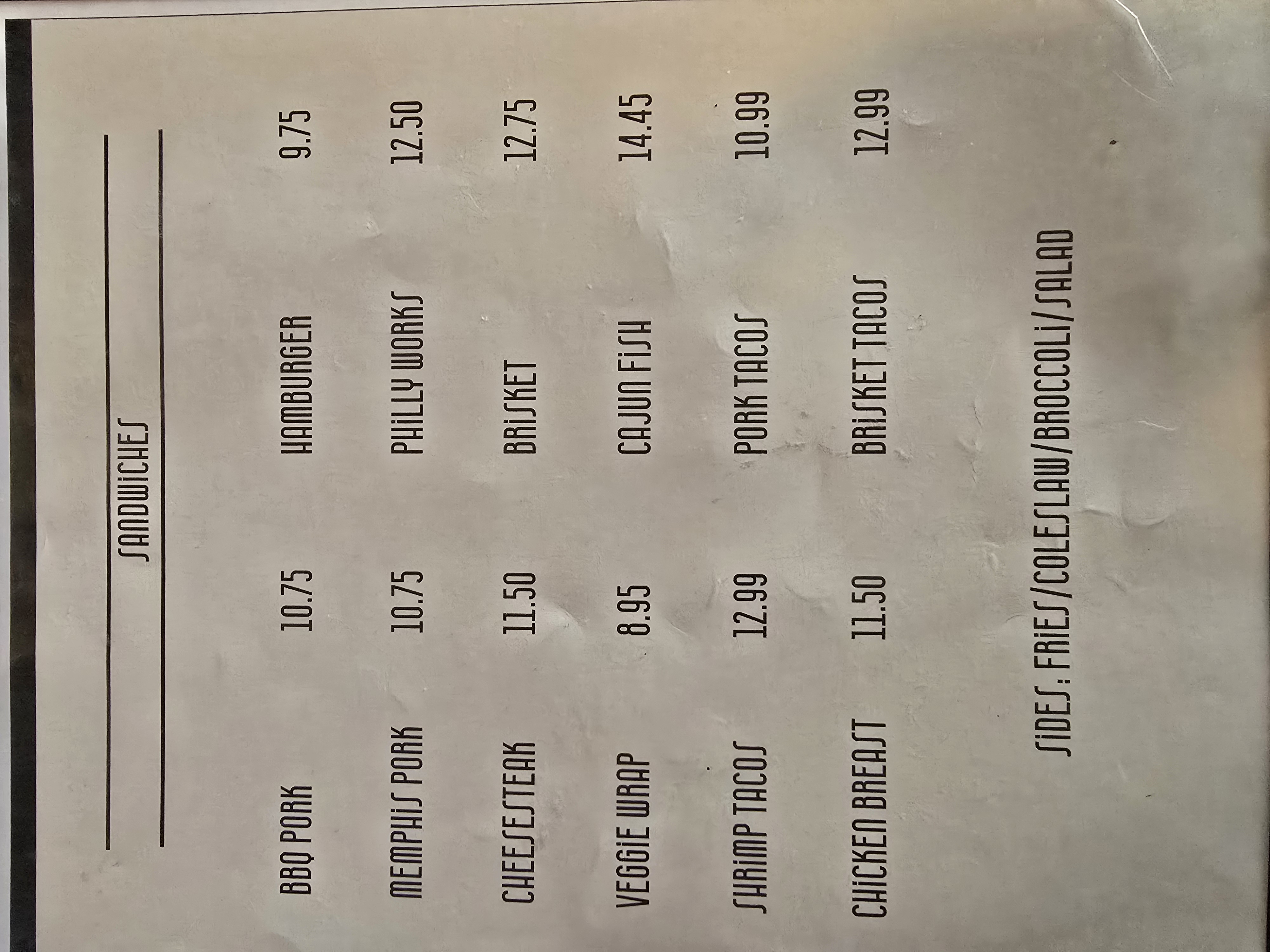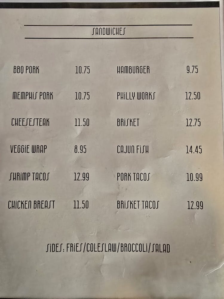 Choice of one side. Fries, coleslaw, broccoli, side salad, smoked beans.